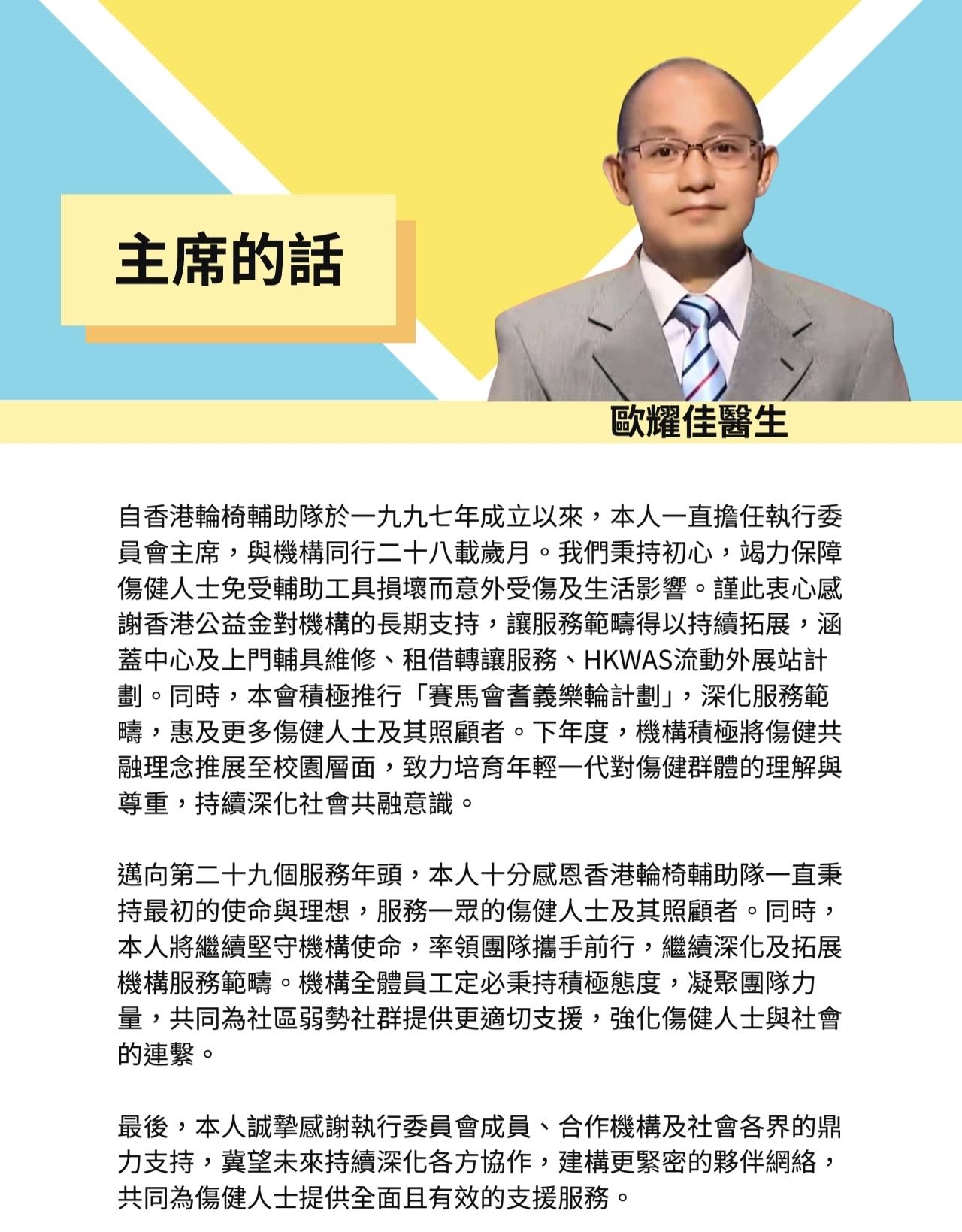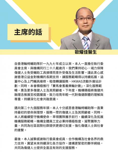 Hong Kong Wheelchair Aid Service (HKWAS) was founded in 1997 by a group of dedicated volunteers. Our mission is to empower the community by providing essential support to individuals with disabilities, their caregivers and those in need. We provide a comprehensive suite of support services, including mobility aid repairs, short-term equipment rentals, social work, and community education. Since our inception, HKWAS has remained steadfast in advocating for a barrier-free society. By delivering timely assistance, we strive to significantly enhance the quality of life for all our service users.